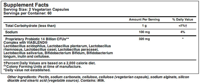 Supplies 14 billion colony forming units (CFUs) of viable probiotics per 2-capsule serving.